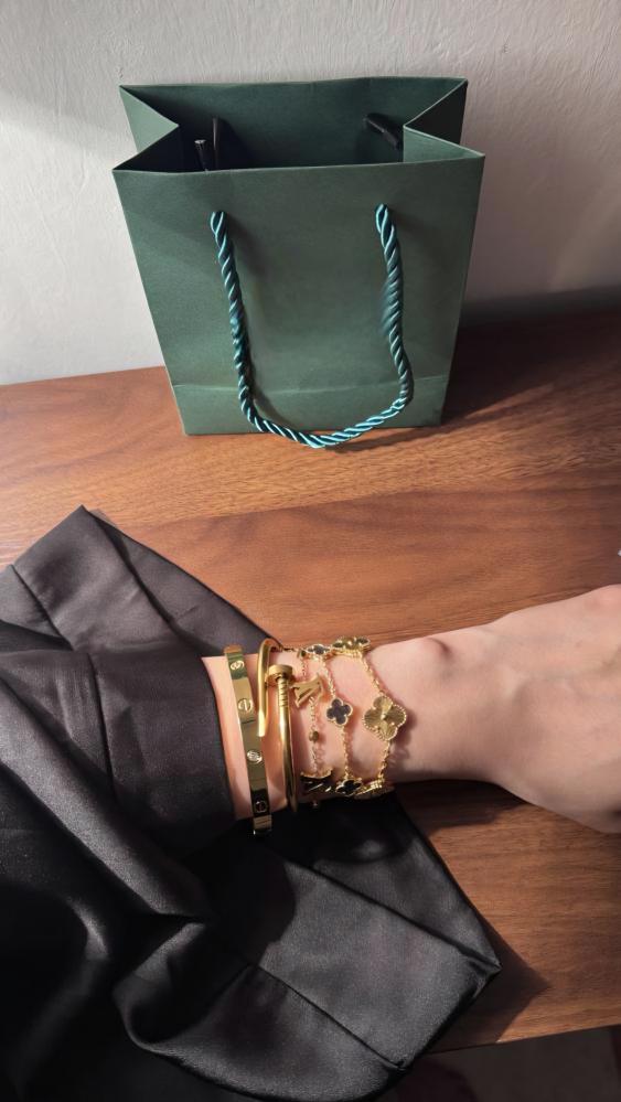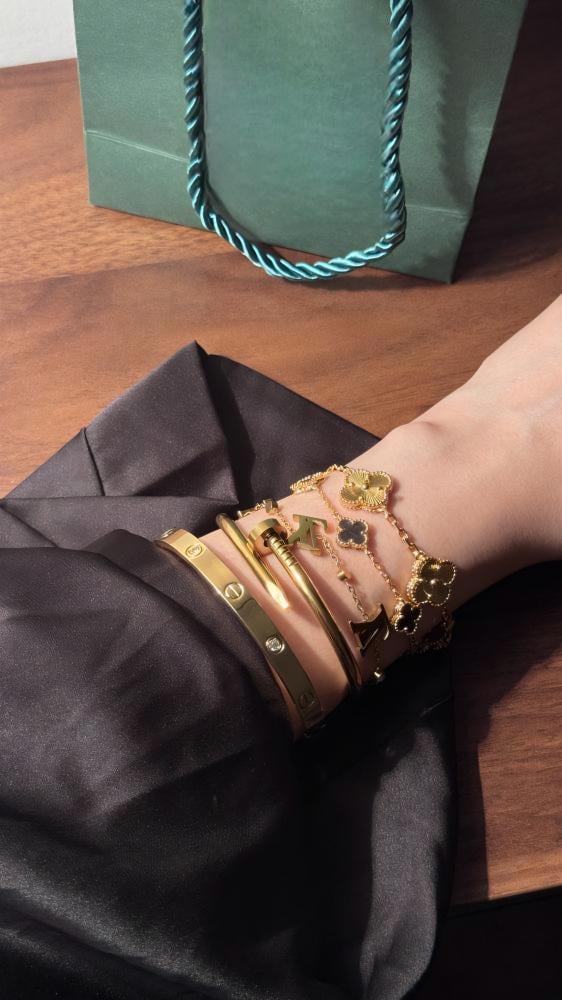 تألقي بإطلالة فاخرة مع مجموعة الأساور الذهبية المميزة التي تجمع بين الأناقة والعصرية تحتوي المجموعة على تصميمات متنوعة تشمل سوارا بتفاصيل زهرة البرسيم المصنوع من عرق اللؤلؤ، وسوارا بسلسلة ذهبية رفيعة مع عقدة أنيقة، بالإضافة إلى سوار بتصميم معدني عصري مرصع بلمسات براقة. هذه المجموعة مثالية لإبراز أنوثتك وتنسيقها مع إطلالاتك اليومية أو المسائية كما تعد خيارا رائعا كهدية فاخرة.